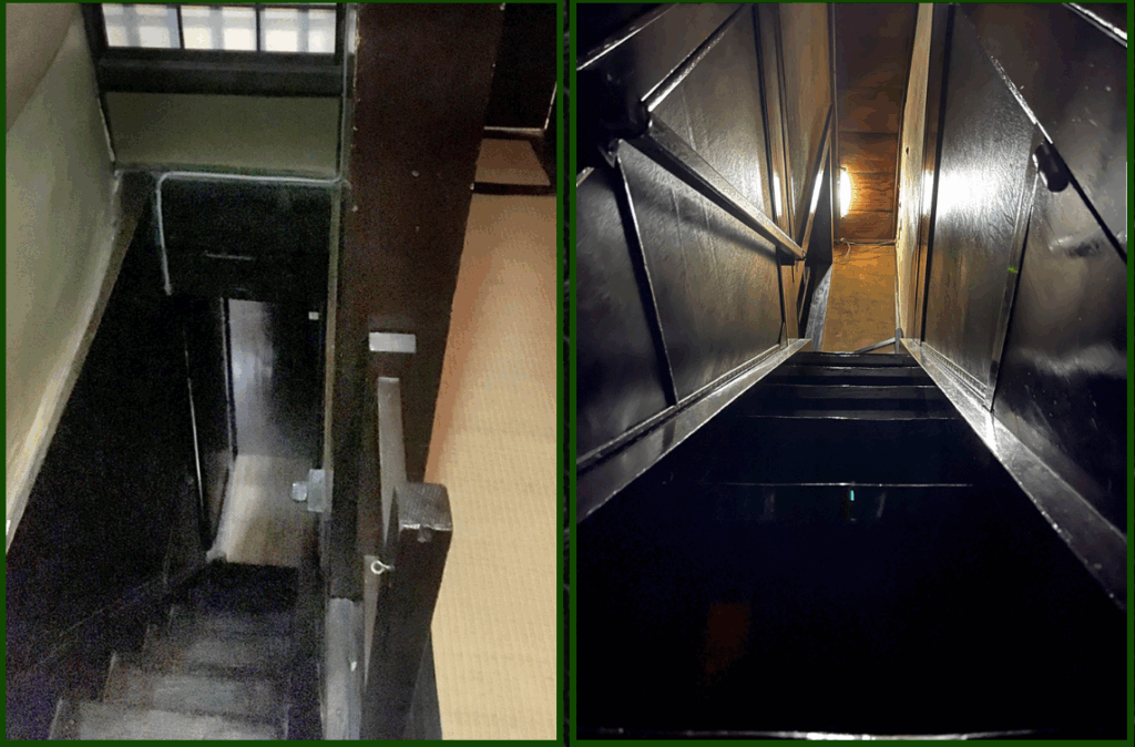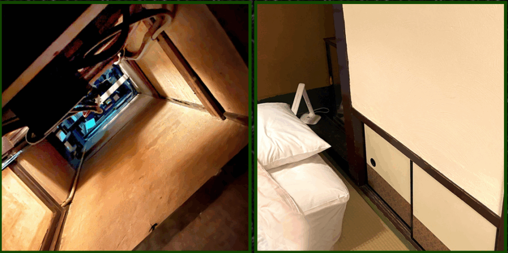 小さな障子戸を開けると、吹き抜けになっています。天井には滑車がつるされており、運搬用エレベーターとして使用されていました。